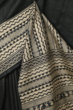 BLACK PLAIN BODY TUSSAR SAREE WITH PRINTED SKIRT BORDER AND BLOUSE PIECE