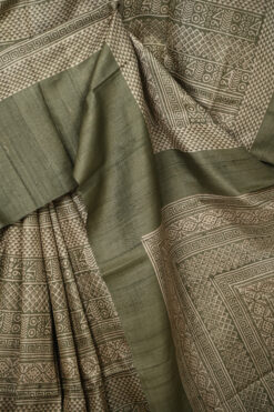 GREEN TUSSAR SAREE WITH GEOMETRICAL PRINT AND PLAIN BORDER WITH BLOUSE PIECE