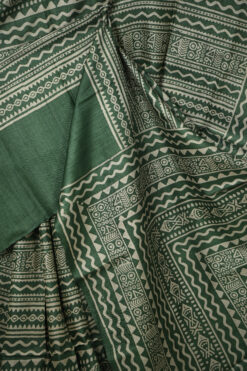 BOTTLE GREEN TUSSAR SAREE WITH GEOMETRICAL PRINT AND PLAIN BORDER WITH BLOUSE PIECE