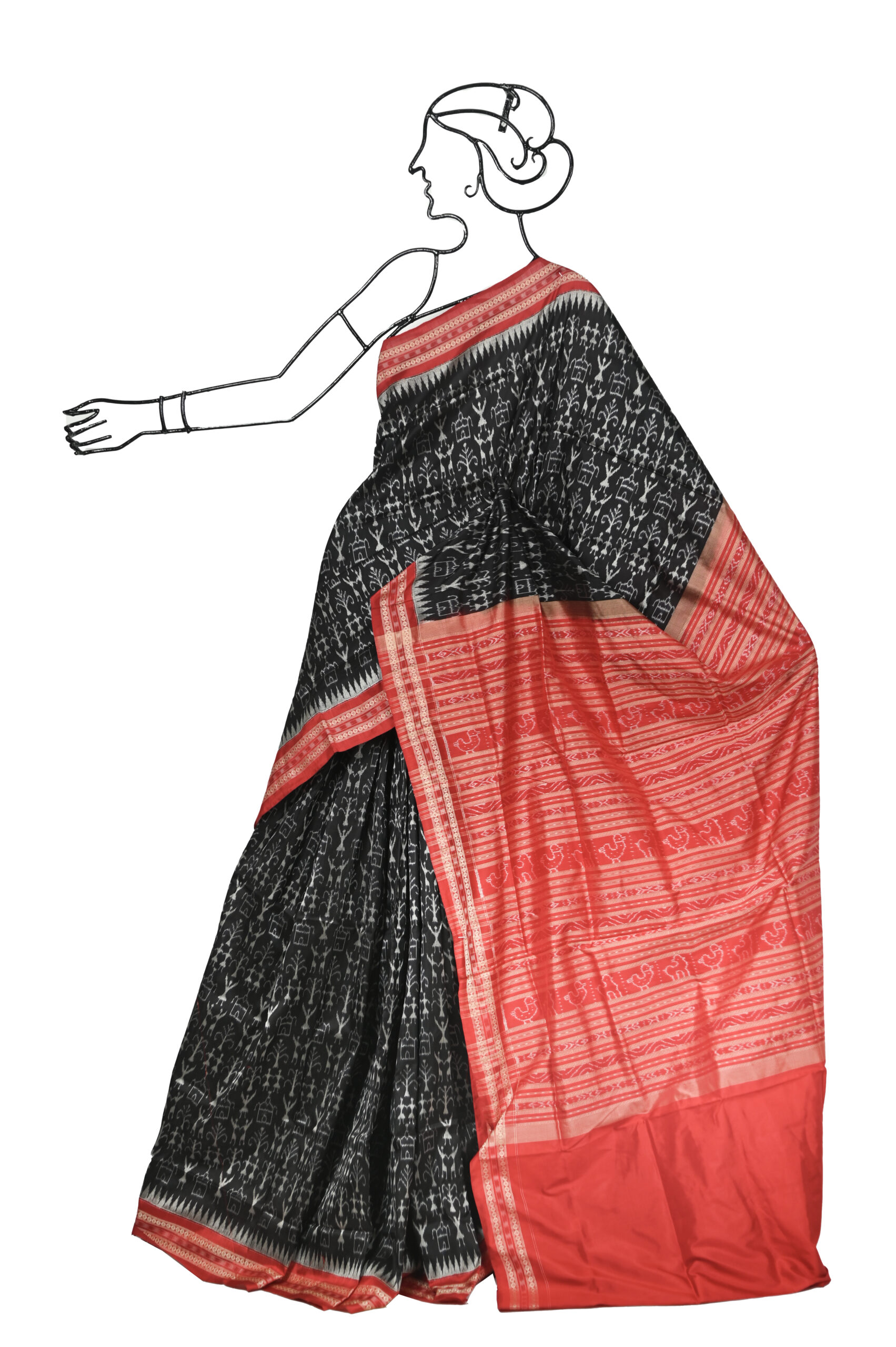 BLACK ORISSA SILK SAREE WITH IKKAT WEAVE AND RED BORDER AND PALLU AND BLOUSE PIECE