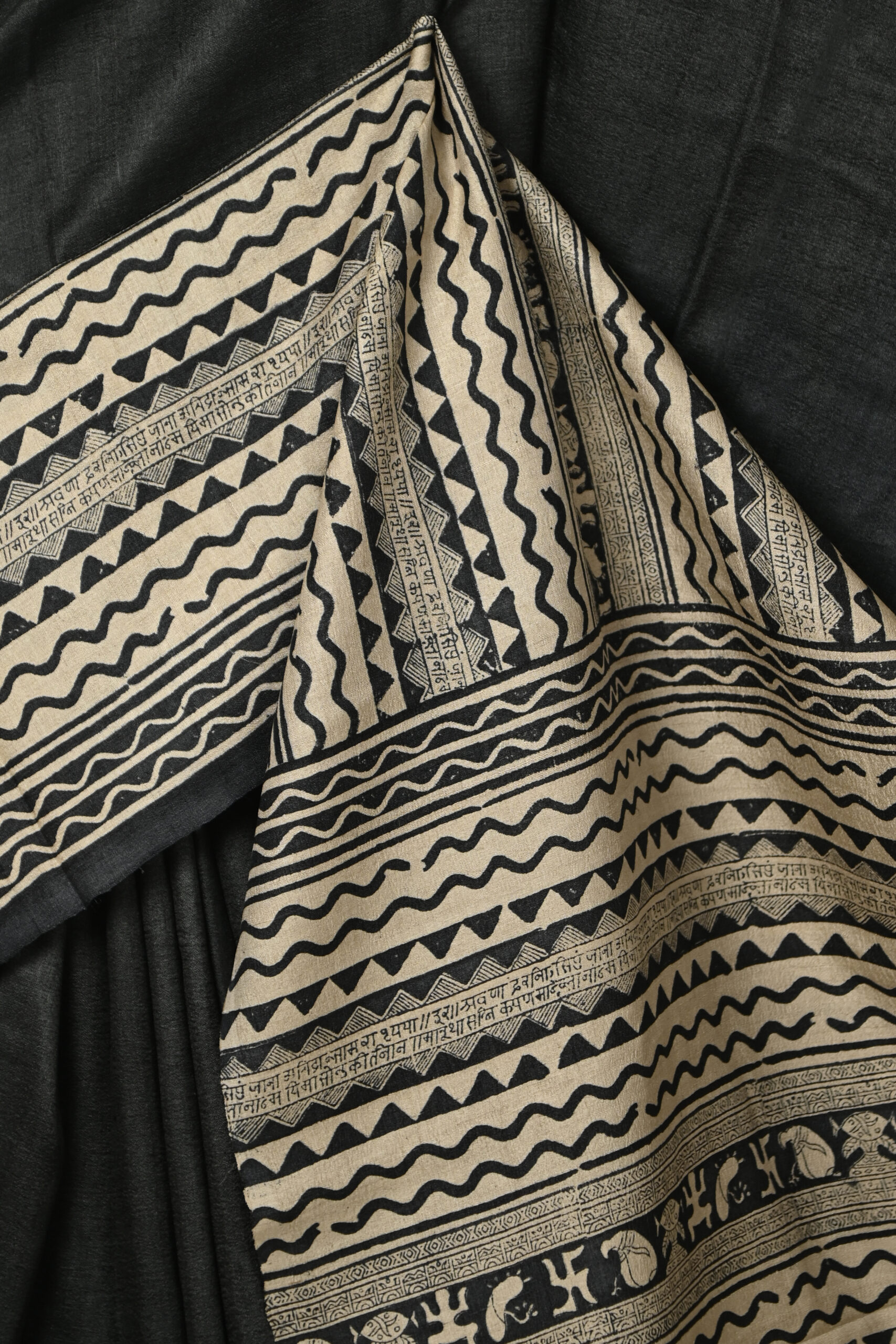 BLACK PLAIN BODY TUSSAR SAREE WITH PRINTED SKIRT BORDER AND BLOUSE PIECE