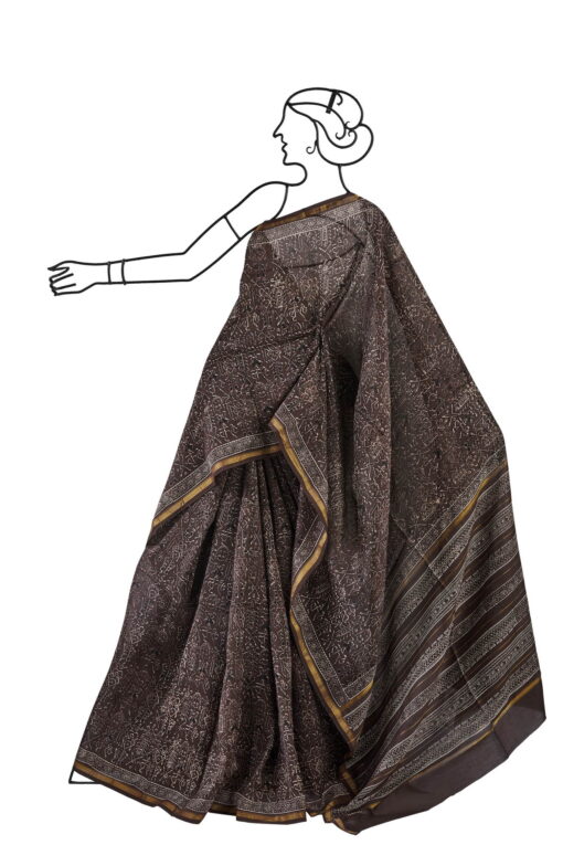 BROWN CHNDERI SAREE WITH ALL OVER SCRIPT BLOCK PRINT AND BLOUSE PIECE