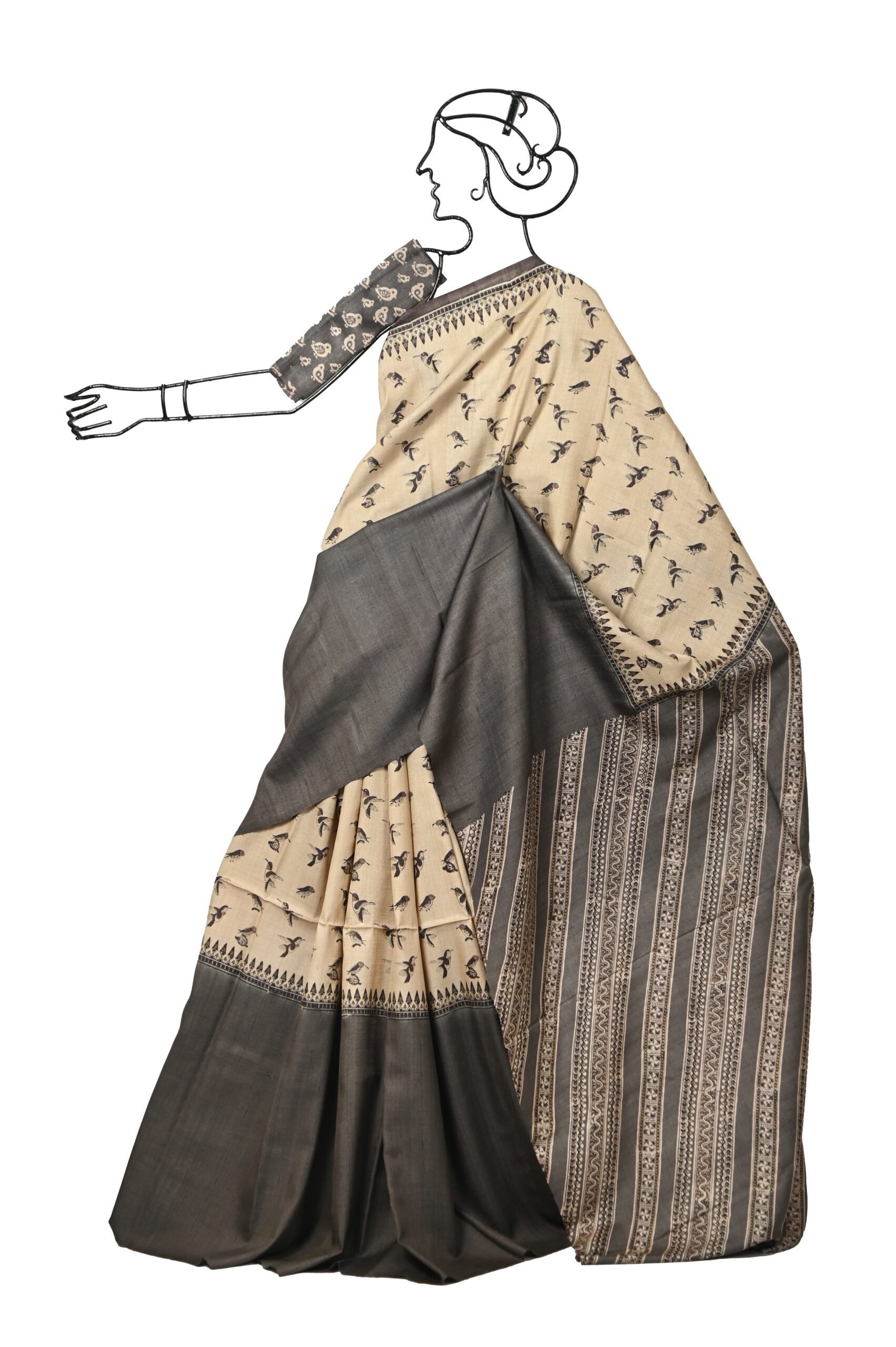 BROWN EIGHTEEN INCHES BORDER TUSSAR SAREE WITH BIRD PRINTED BODY AND BLOUSE PIECE