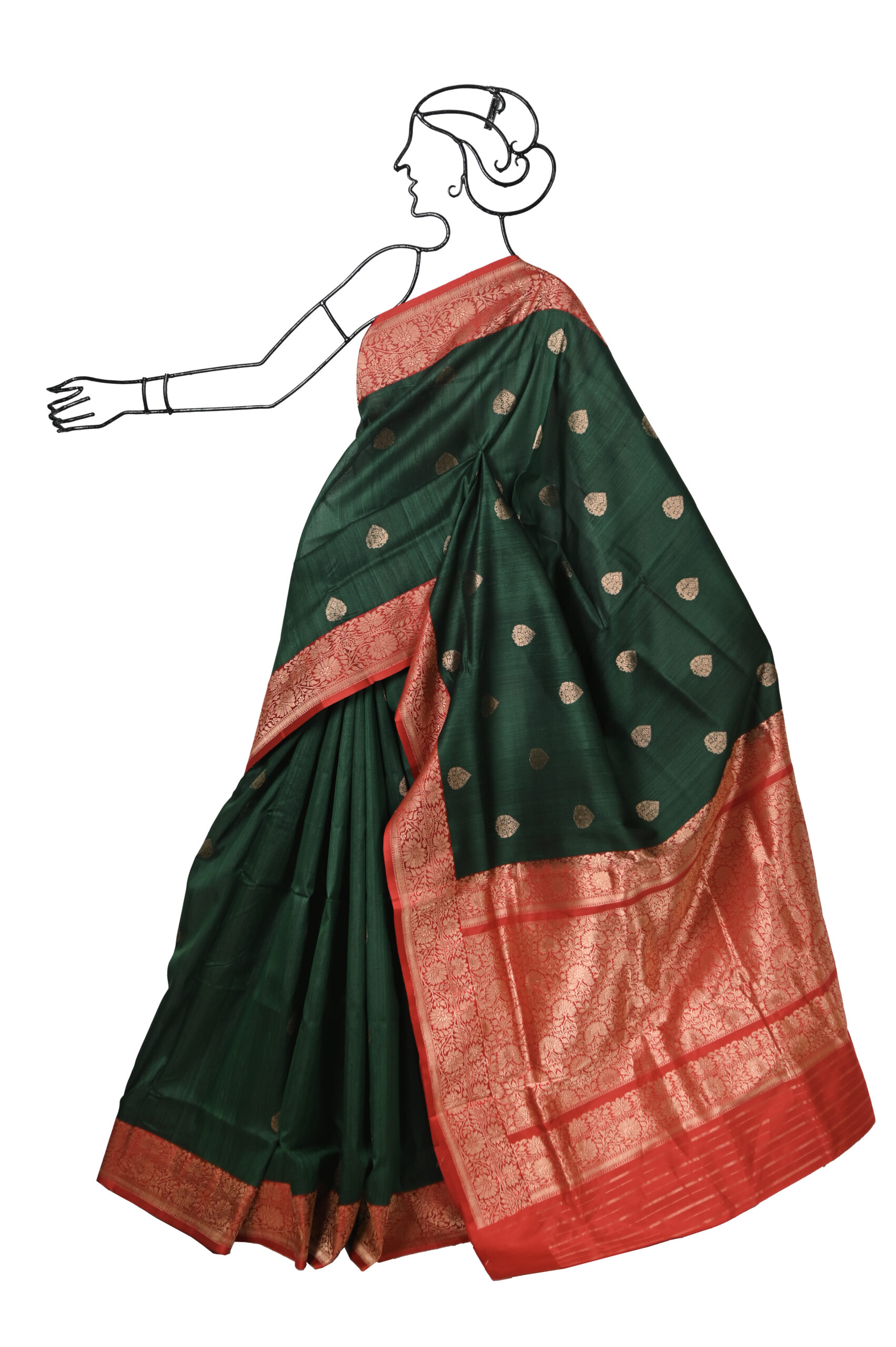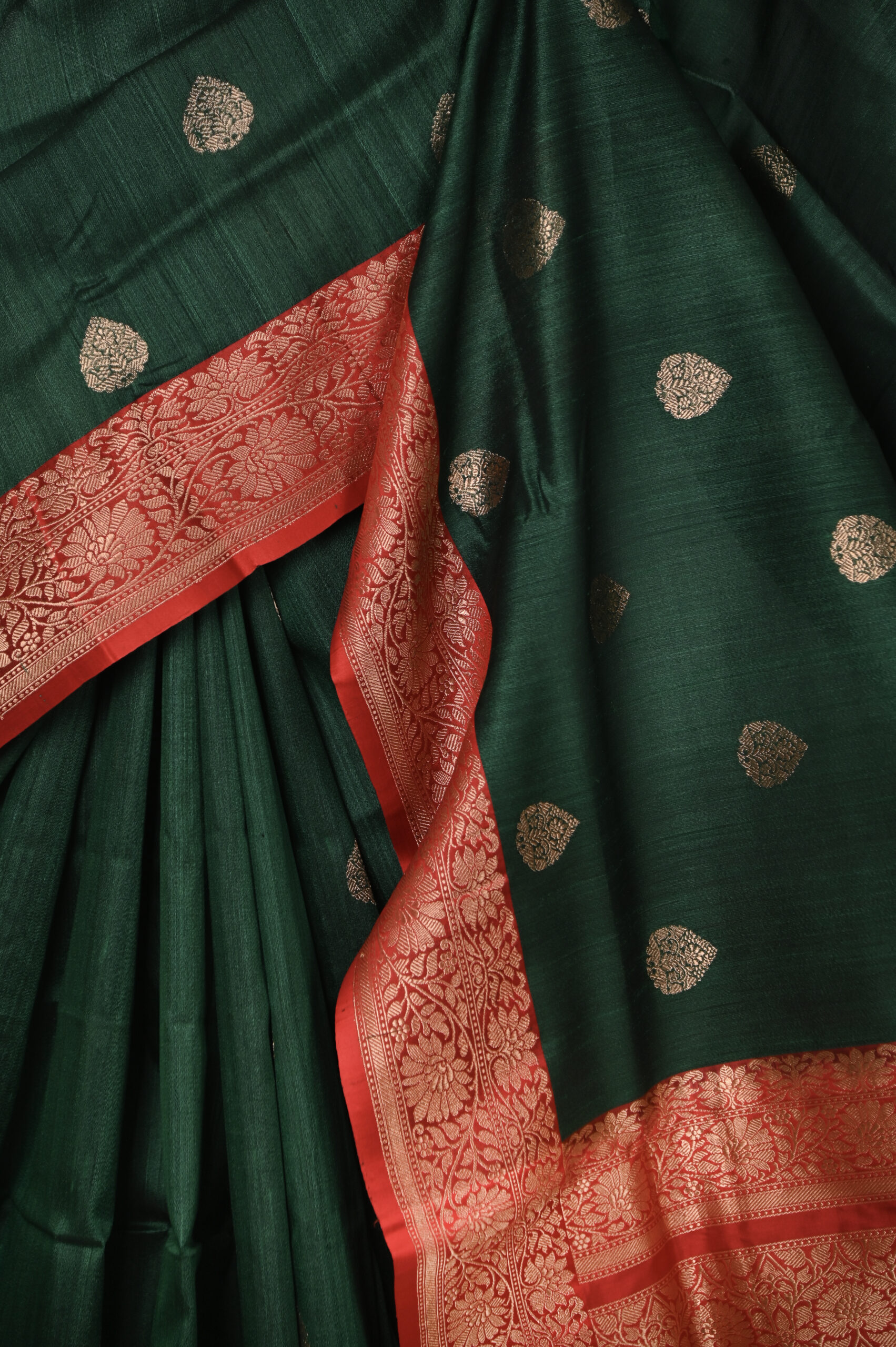 GREEN TUSSAR BENARASI SAREE WITH ZARI BUTA AND RED PALLU WITH BLOUSE PIECE
