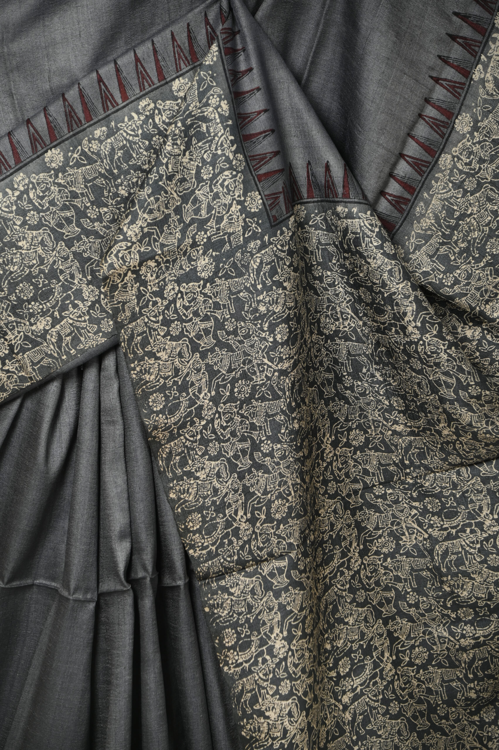 GREY TUSSAR SAREE WITH BLACK AND MAROON PRINTED GANGA YAMUNA BORDER WITH BLOUSE PIECE