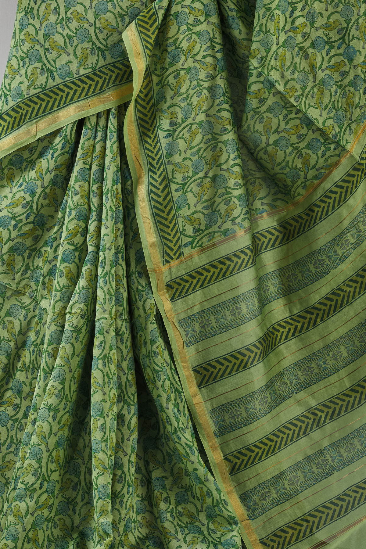 LIGHT GREEN CHANDERI SAREE WITH ALL OVER BIRD BLOCK PRINT AND BLOUSE PIECE