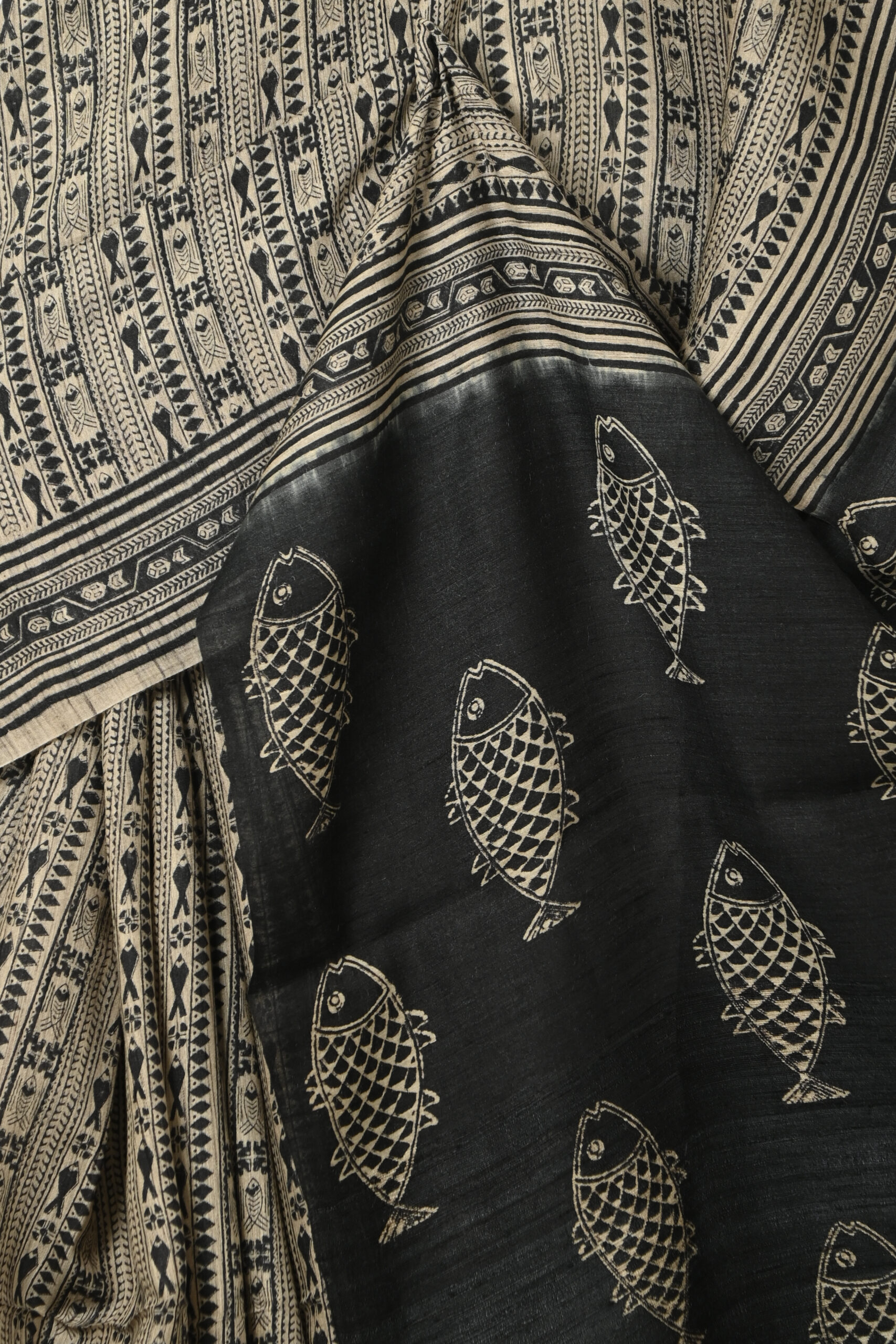 NATURAL BASE BHAGALPURI TUSSAR SAREE WITH FISH PRINT WITH BLOUSE PIECE