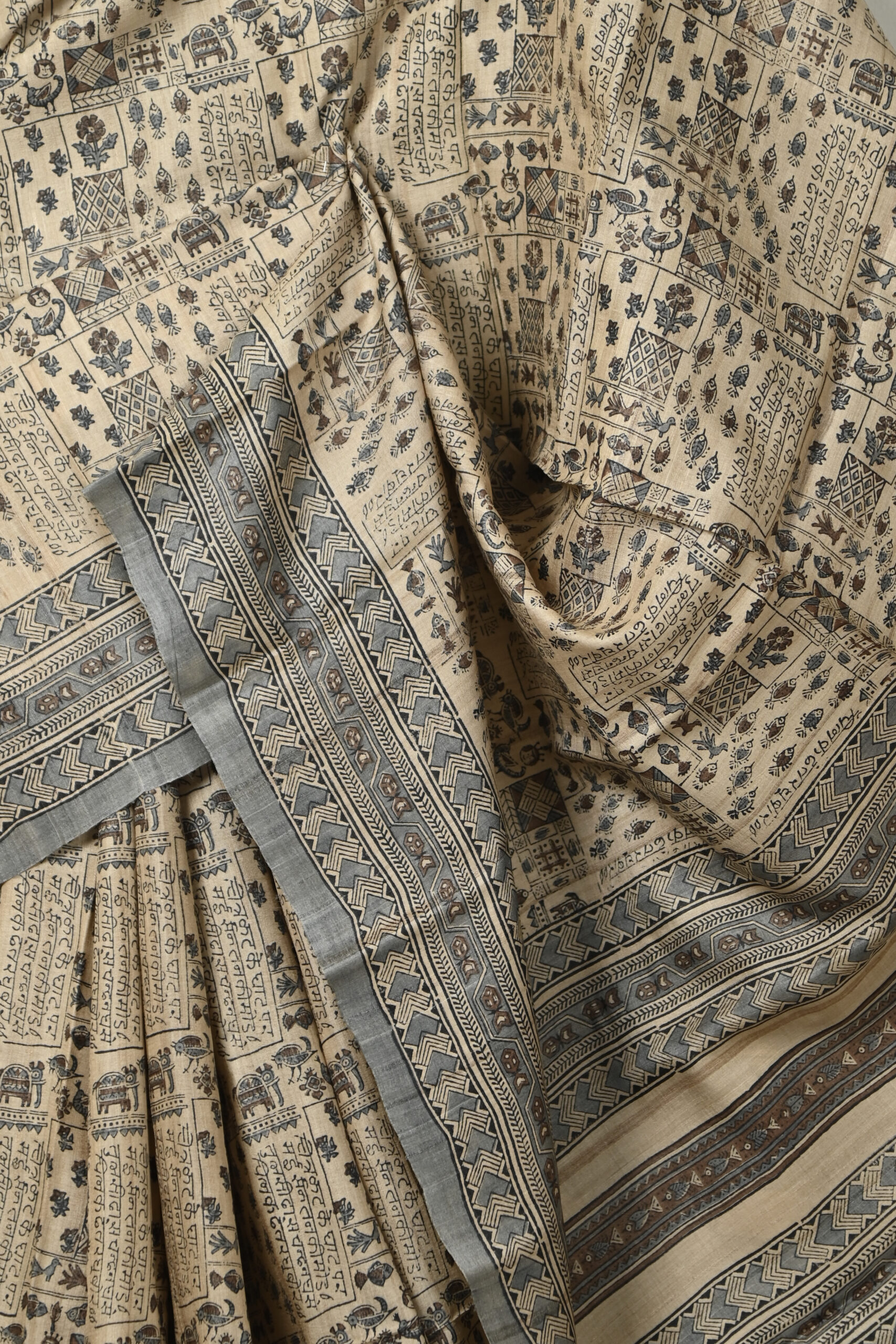 NATURAL BASE TUSSAR SAREE WITH ALL OVER SCRIPT PRINT AND WITHOUT BLOUSE PIECE