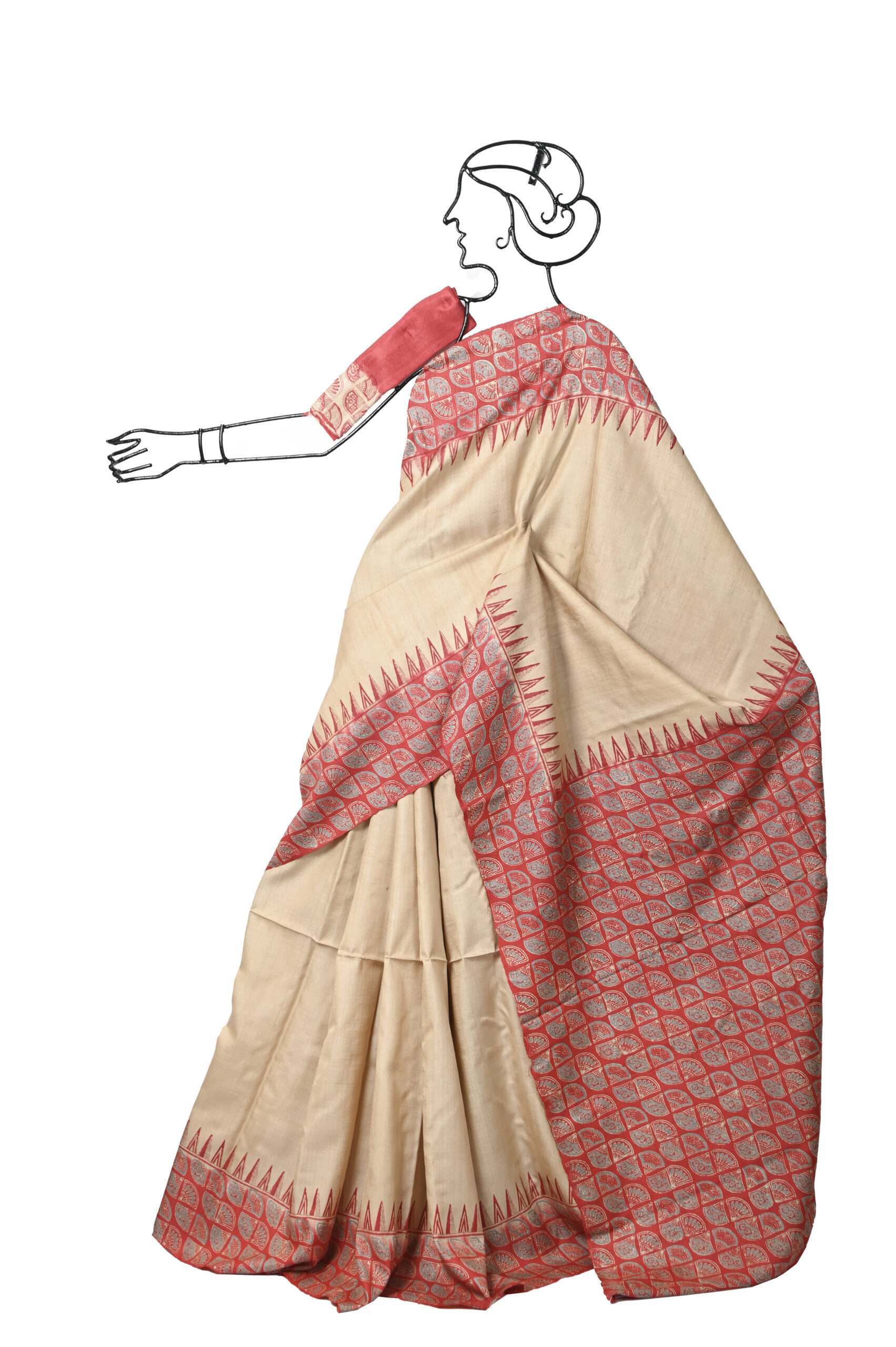 NATURAL BASE TUSSAR SAREE WITH RED PRINTED BORDER AND PALLU WITH BLOUSE PIECE