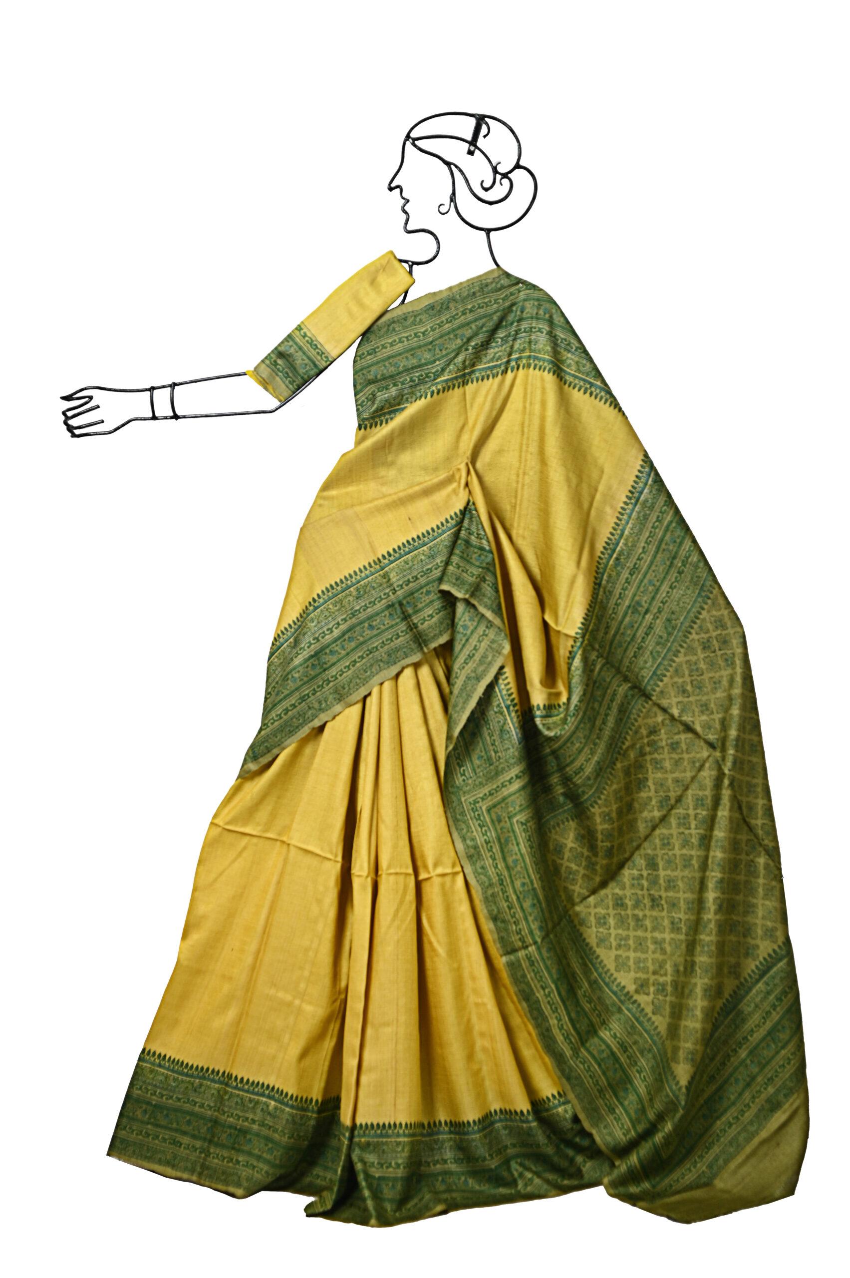 Be the first to review “YELLOW TUSSAR SAREE WITH GREEN PRINTED BORDER AND PALLU WITH BLOUSE PIECE” Cancel reply