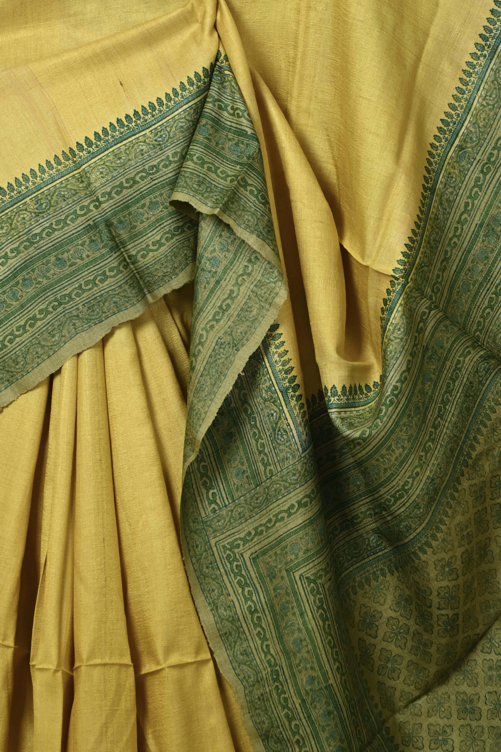 YELLOW TUSSAR SAREE WITH GREEN PRINTED BORDER AND PALLU WITH BLOUSE PIECE