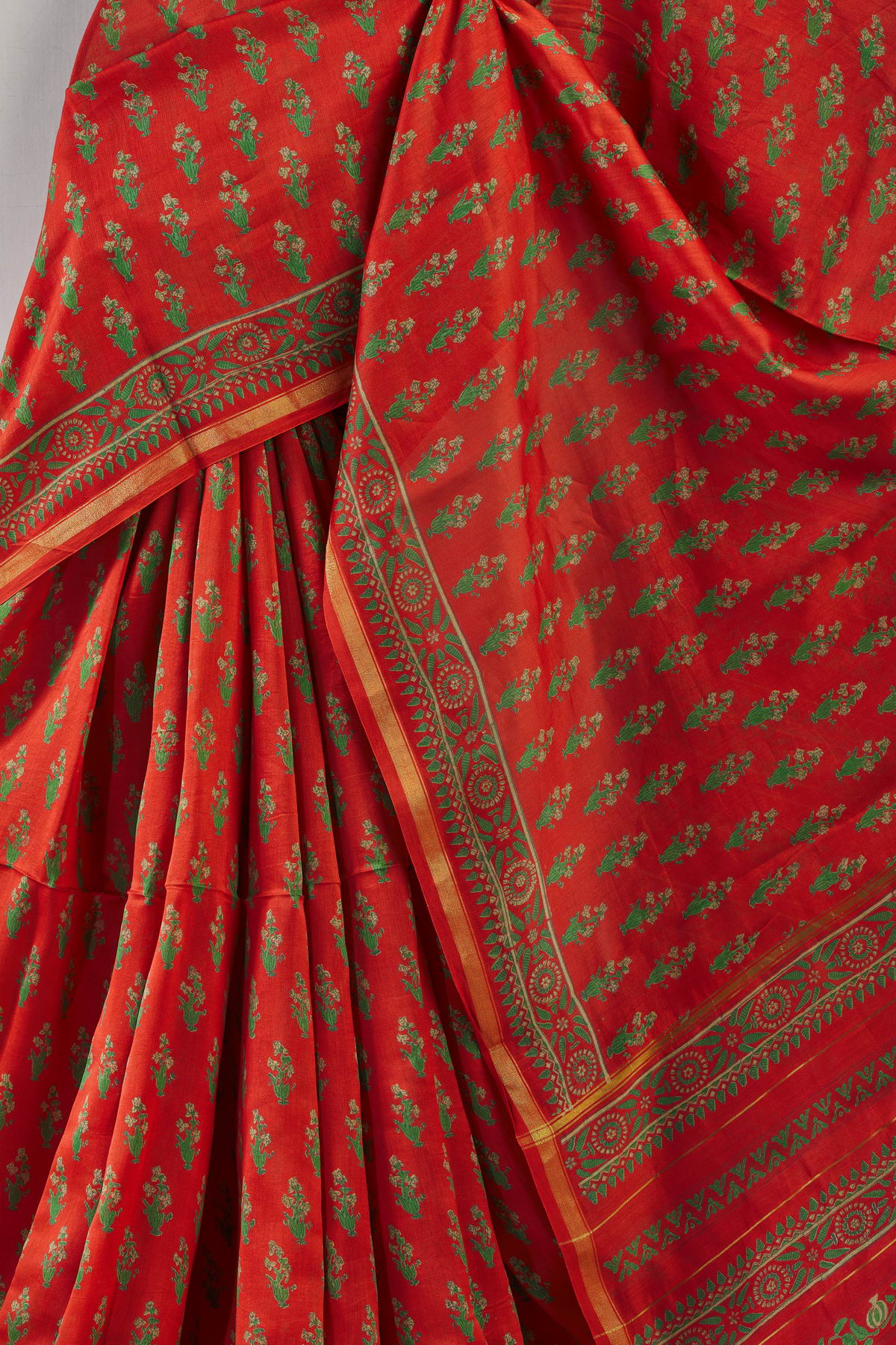 RED CHANDERI SAREE WITH ALL OVER FLORAL BLOCK PRINT AND BLOUSE PIECE