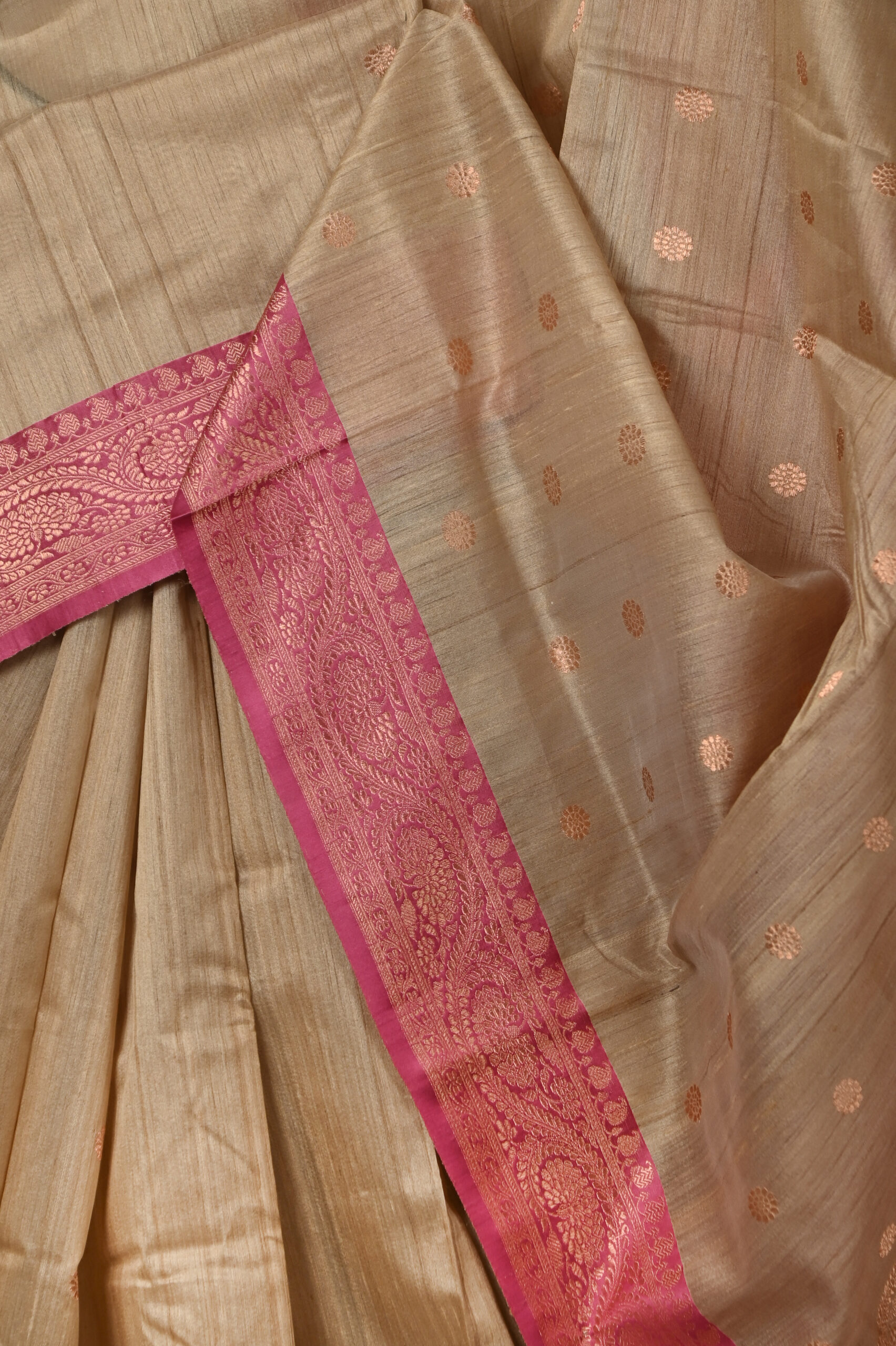 BEIGE TUSSAR BENARASI SAREE WITH ZARI BUTA AND PINK PALLU WITH BLOUSE PIECE