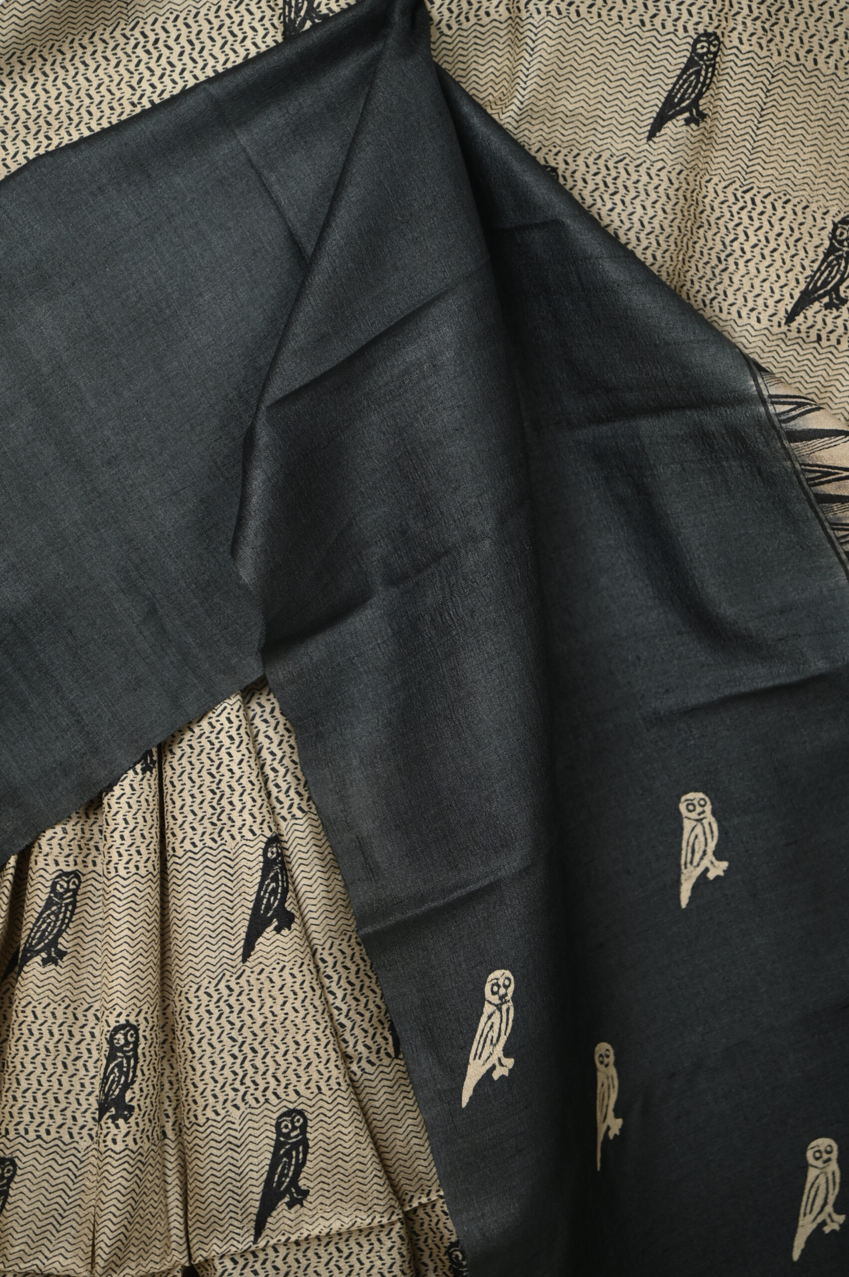 BLACK EIGHTEEN INCHES BORDER TUSSAR SAREE WITH BIRD PRINTED BODY AND BLOUSE PIECE