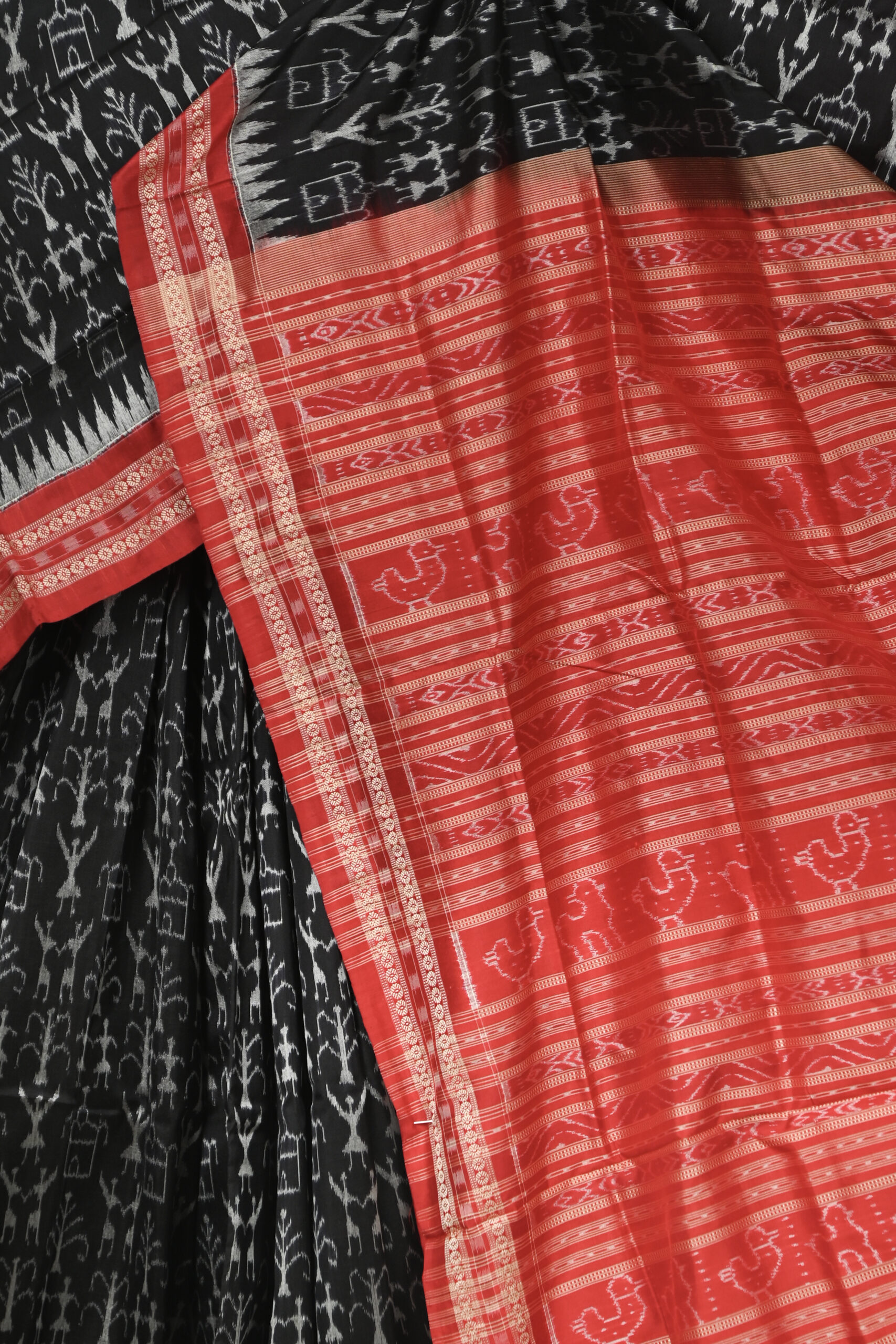 BLACK ORISSA SILK SAREE WITH IKKAT WEAVE AND RED BORDER AND PALLU AND BLOUSE PIECE