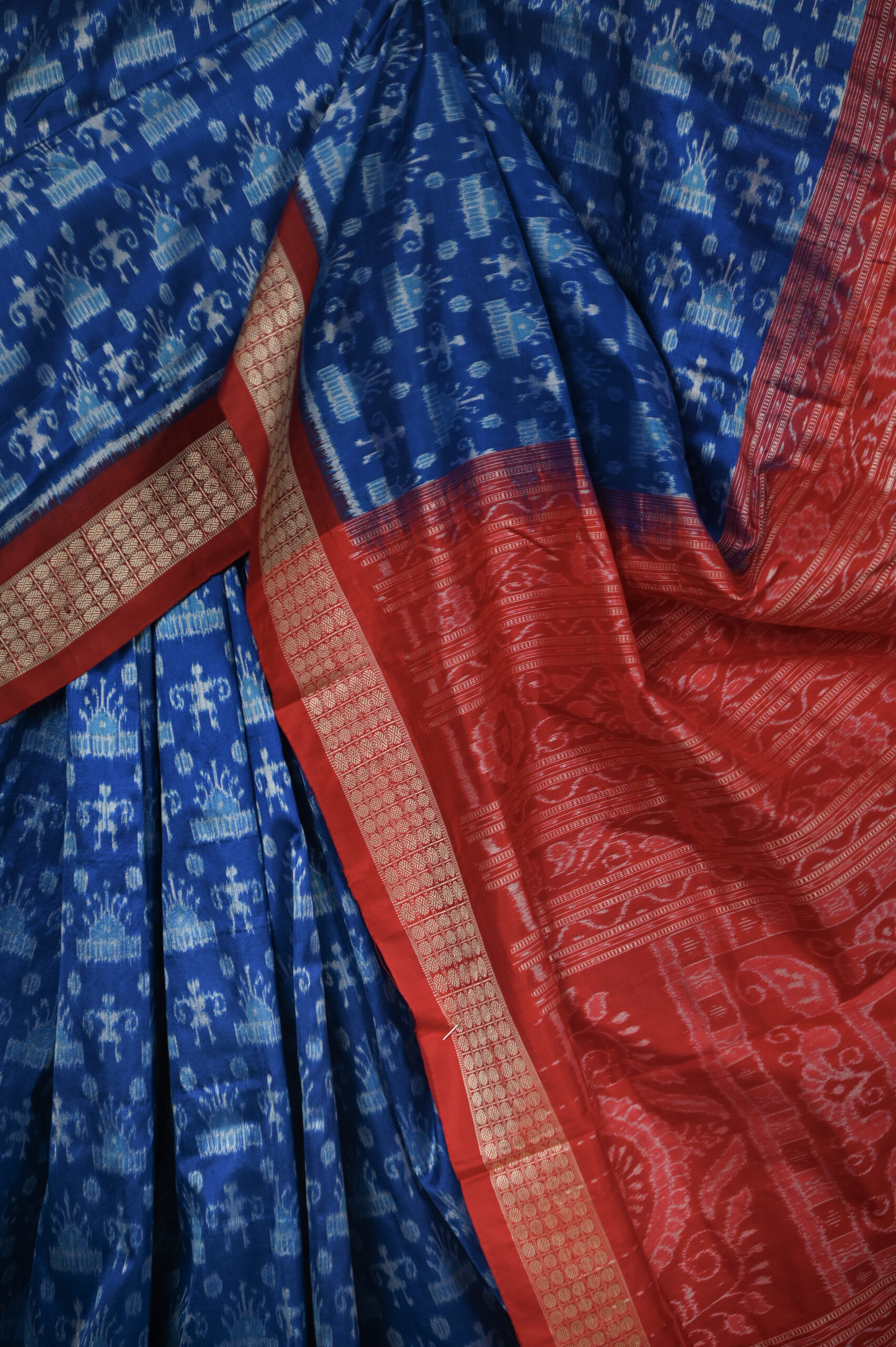 BLUE ORISSA SILK SAREE WITH IKKAT WEAVE AND RED BORDER AND PALLU AND BLOUSE PIECE