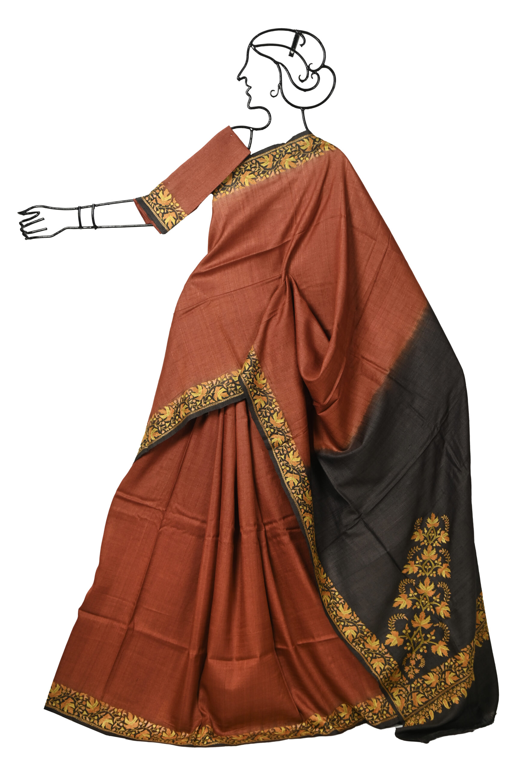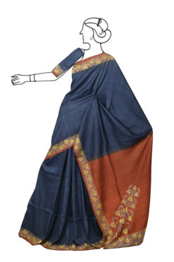 NAVY BLUE AND RUST TUSSAR SAREE WITH KASHMIRI EMBROIDERED BORDER AND PALLU WITH BLOUSE PIECE