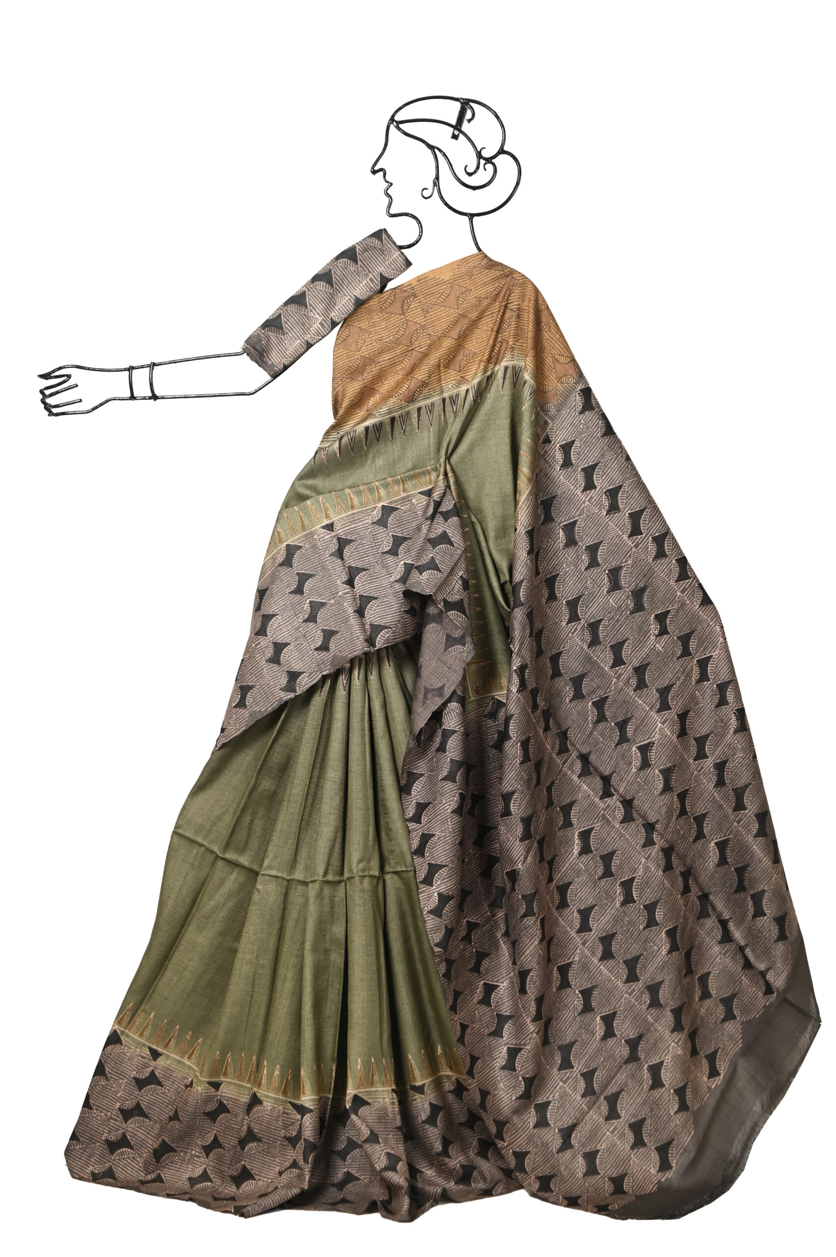 GREEN TUSSAR SAREE WITH BROWN AND YELLOW PRINTED GANGA YAMUNA BORDER WITH BLOUSE PIECE