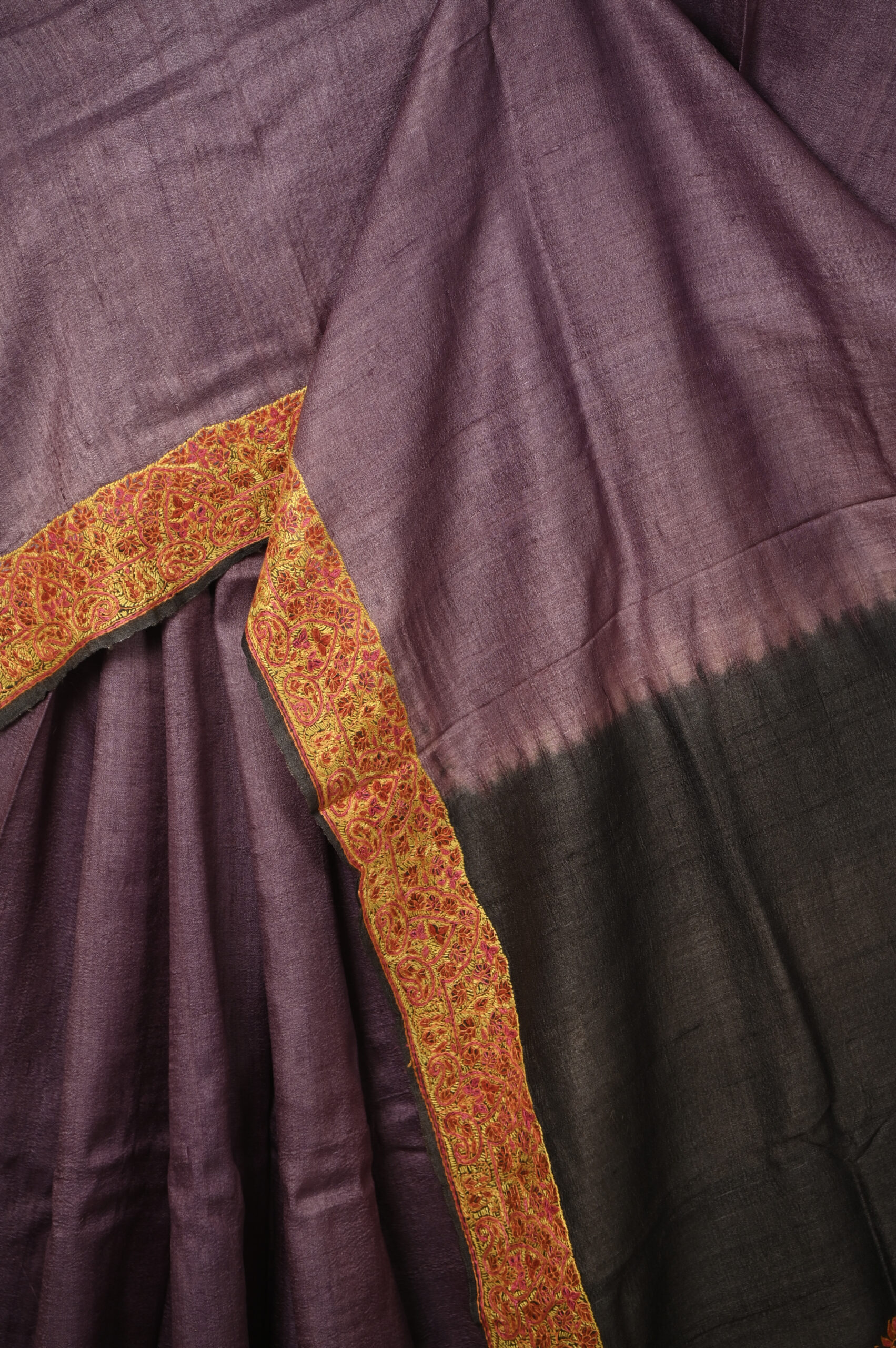 LAVENDER AND BROWN TUSSAR SAREE WITH KASHMIRI EMBROIDERED BORDER AND PALLU WITH BLOUSE PIECE