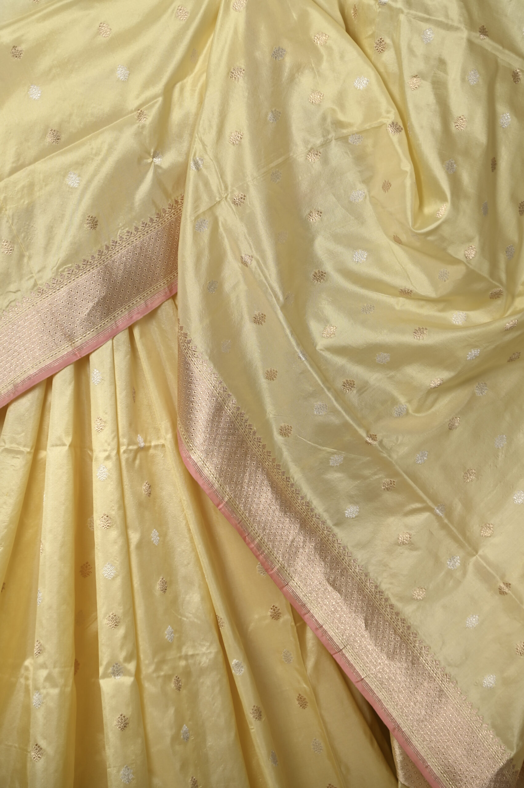 LIGHT BEIGE KATAN BENARASI SAREE WITH ALL OVER ZARI BUTI AND BLOUSE PIECE