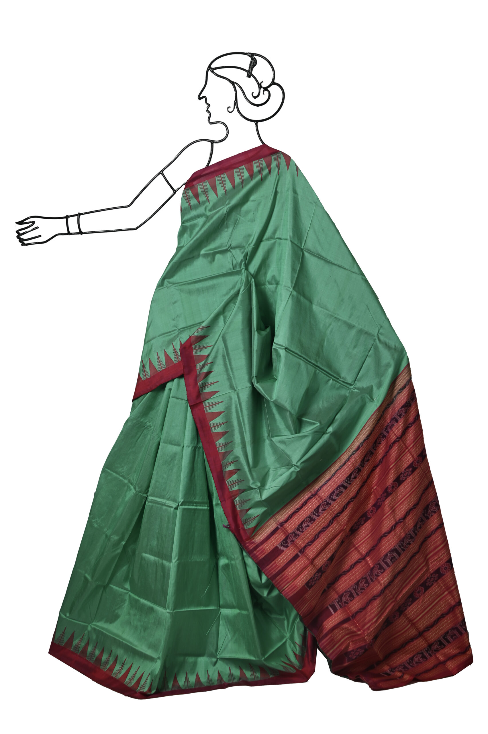 LIGHT GREEN ORISSA SILK SAREE WITH RED TEMPLE BORDER AND PALLU AND BLOUSE PIECE