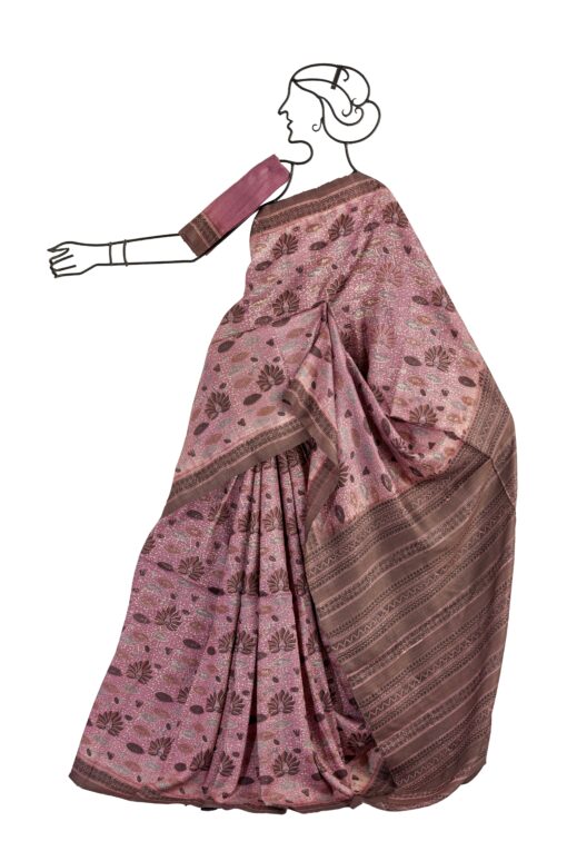 MAUVE TUSSAR SILK SAREE WITH BROWN FLORAL BLOCK PRINT AND BLOUSE PIECE