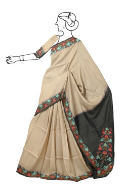 OFF WHITE AND BLACK TUSSAR SAREE WITH KASHMIRI EMBROIDERED BORDER AND PALLU WITH BLOUSE PIECE