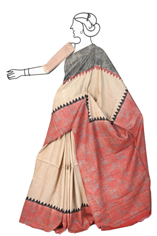 NATURAL TUSSAR SILK SAREE WITH RED AND BLACK BLOCK PRINT GANGA YAMUNA BORDER AND BLOUSE PIECE
