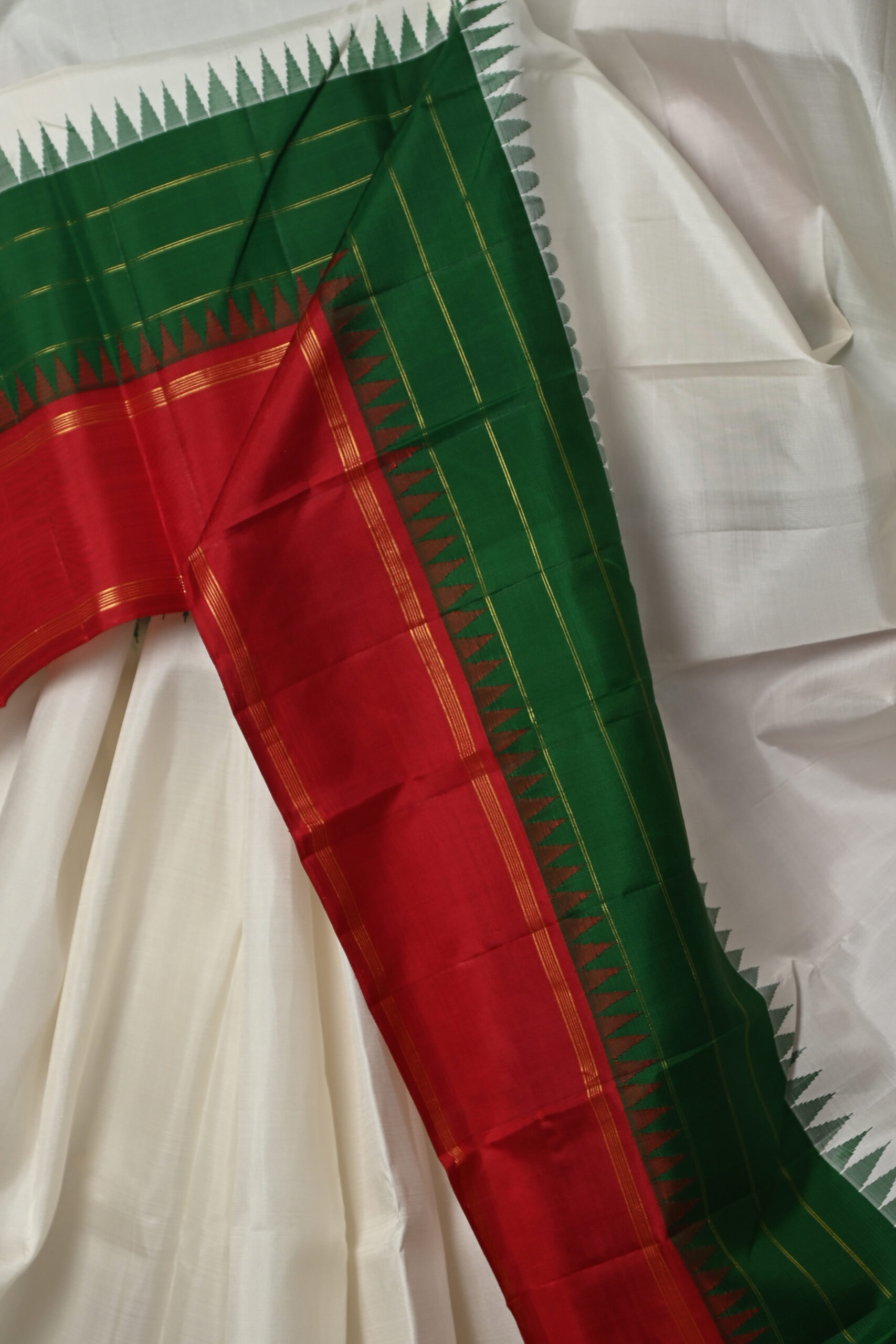 OFF WHITE KANJEEVARAM SAREE WITH GREEN AND RED TEMPLE BORDER AND BLOUSE PIECE