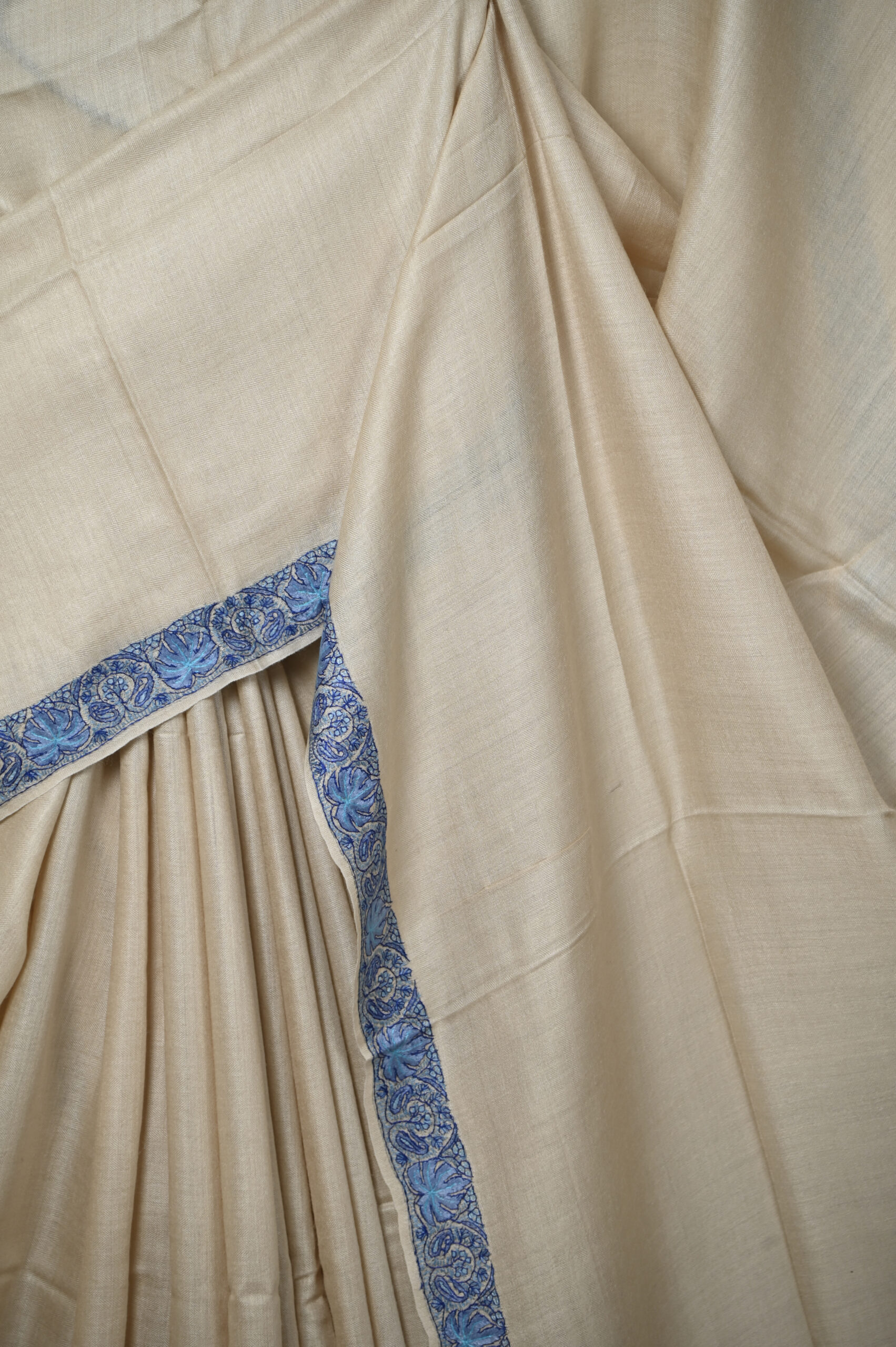 OFF WHITE TUSSAR SAREE WITH KASHMIRI EMBROIDERED BORDER AND PALLU WITH BLOUSE PIECE