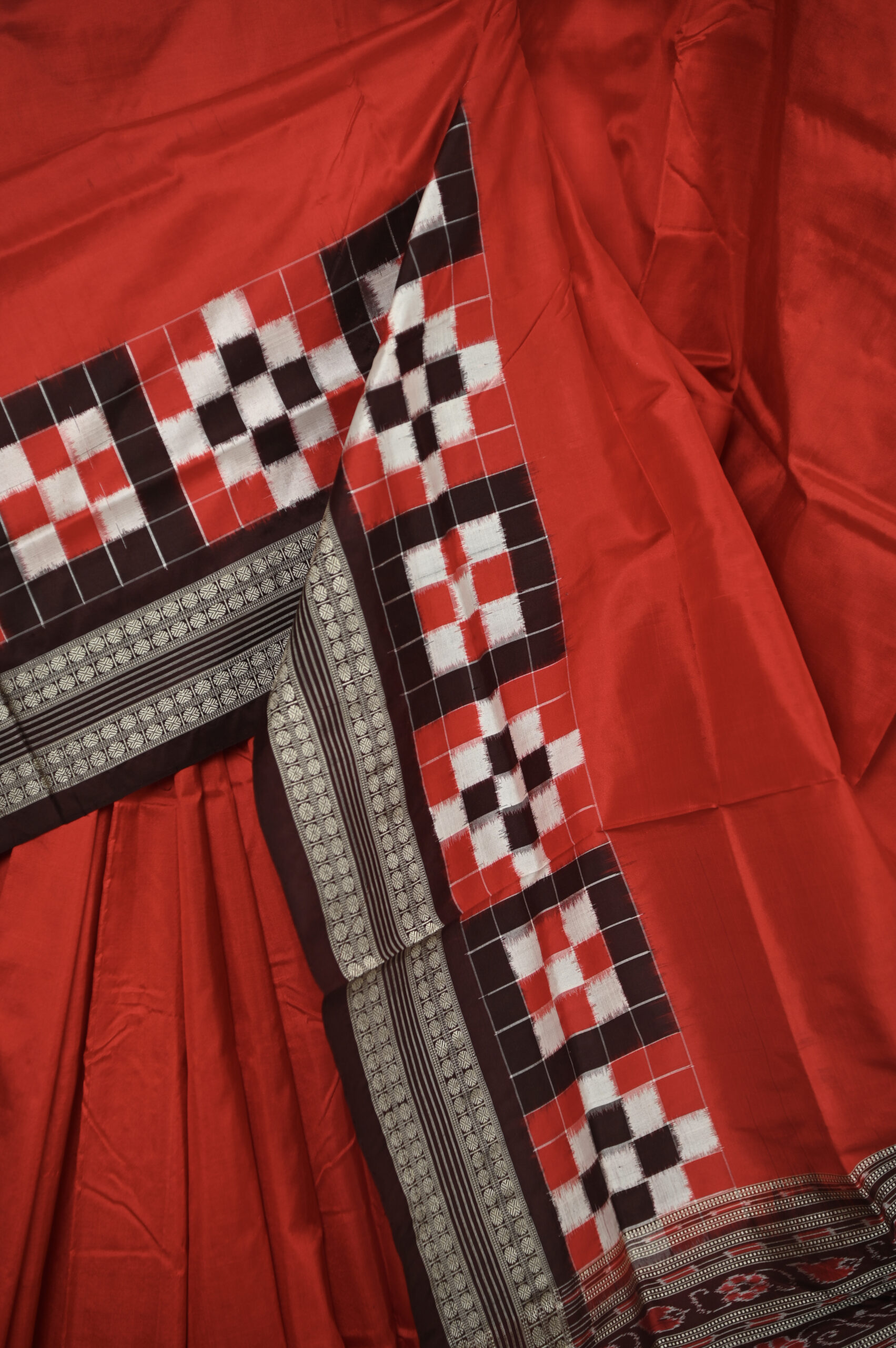 RED ORISSA SILK SAREE WITH BROWN IKKAT WEAVE BORDER AND PALLU AND BLOUSE PIECE