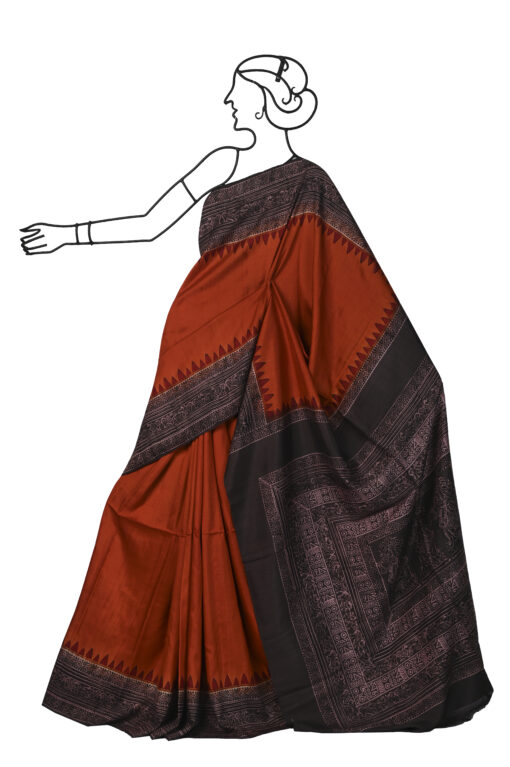RUST PLAIN SILK SAREE WITH BLOCK PRINT BORDER AND PALLU